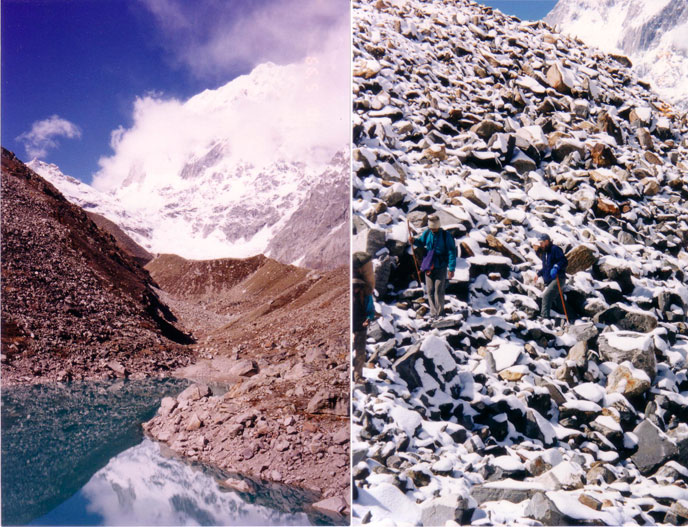 A la izquierda, el lago Santopanth Tal en octubre de 1999. A la derecha, Govindan Satchidananda y Rohit escalanado hacia el lago Santopath.